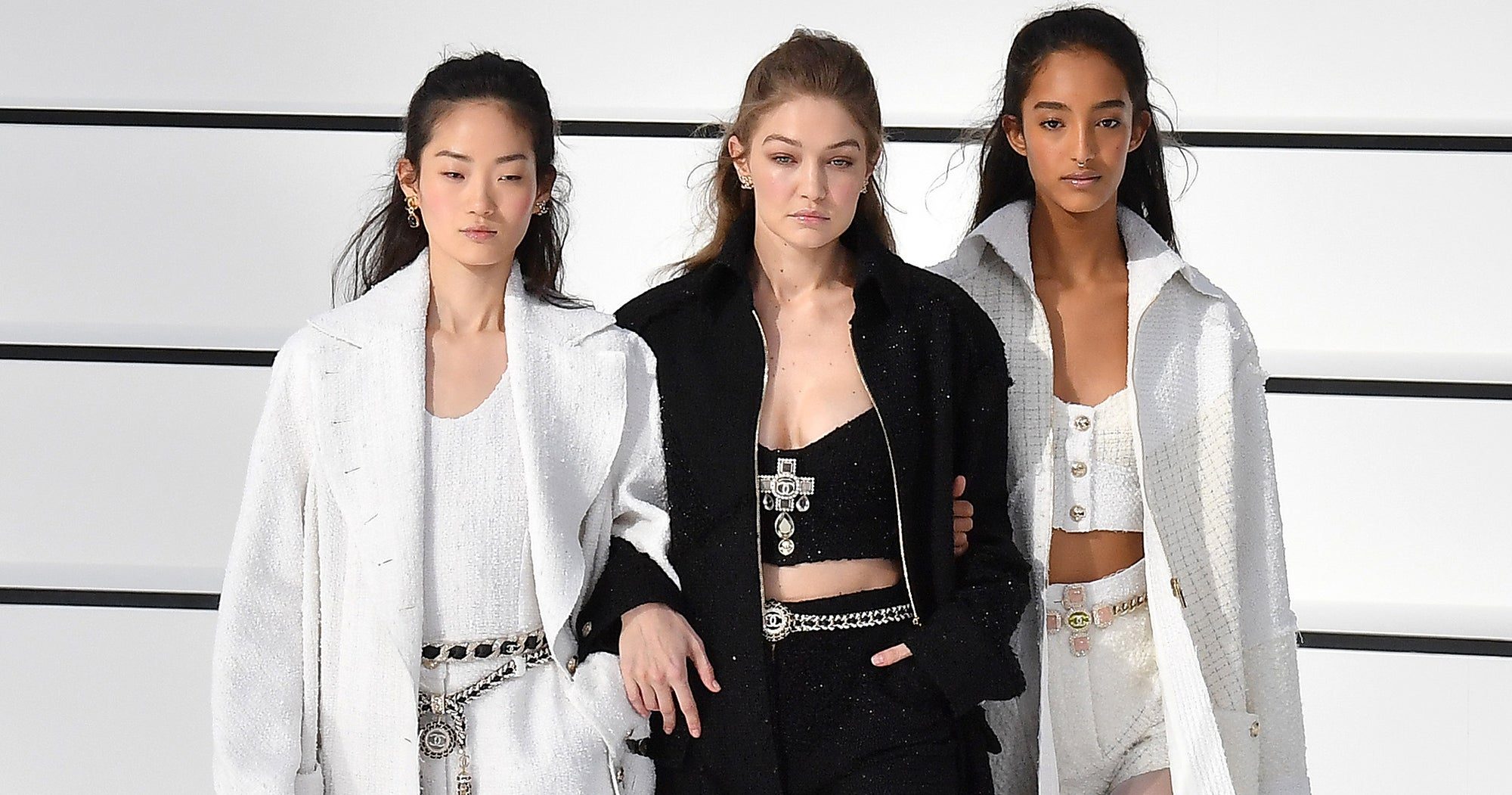 And, the looks! In a classic colour palette of black, white, and grey, with pops of kiwi green, hot pink, and red, the collection leaned heavily on very ‘90s Chanel brand codes with some youthful updates: shorts with crop tops and layers of jewellery; cosy joggers that buttoned down the leg; a cropped pink puffer coat made of a looped fabric; dramatic Victorian dresses; coats that matched trousers, and — perhaps more interestingly — coats that didn’t match trousers. Like many other shows this season, there was a boyish necktie moment, as well as a feathered top, and lots of statement sleeves.